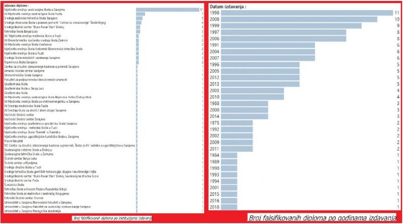 Analizom podataka prikupljenih provjerama diploma Ured za borbu protiv korupcije utvrdio je kako je ubjedljivo najviše falsifikata iz Mješovite srednje saobraćajne škole u Sarajevu. Čak 51 diploma ima pečat ove obrazovne ustanove, što je više od 40 odsto ukupno otkrivenih ovakvih lažnih dokumenata u Kantonu Sarajevo. Drugoplasirana na ovoj neslavnoj listi je Mješovita saobraćajna škola iz Tuzle sa sedam slučajeva.