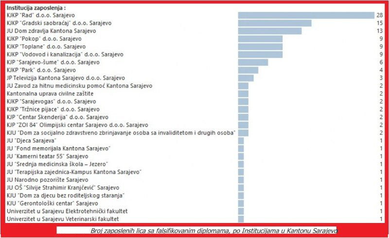 Najviše zaposlenih sa lažnom diplomom je u KJKP “Rad”, njih 28, vicešampion je GRAS sa 15, dok je u sarajevskom Domu zdravlja pronađeno 13 falsifikata.