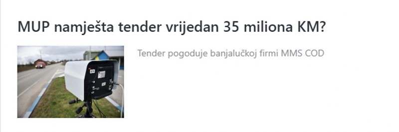 Iz MUP-a nisu dali pojašnjenje zašto za nabavku 110 radarskih uređaja planiraju da izdvoje čak 35 miliona KM kada je 2019. godine 110 radarskih uređaja nabavljeno za deset miliona KM. Ipak, odlukom o poništenju ove javne nabavke za sada je preduprijeđena šteta koju je mogao da pretrpi MUP ovom po svemu sudeći očigledno namještenom javnom nabavkom.