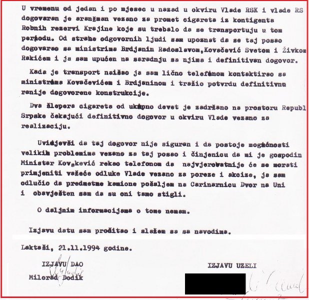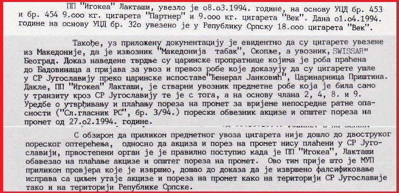 „MUP je došao do dokaza da je izvršeno falsifikovanje isprava sa ciljem utaje akciza i poreza na promet, kako na teritoriji SR Jugoslavije, tako i na teritoriji RS“, navodi se u Rješenju Finansijske policije RS na žalbu Dodikove firme Igokea iz Laktaša.