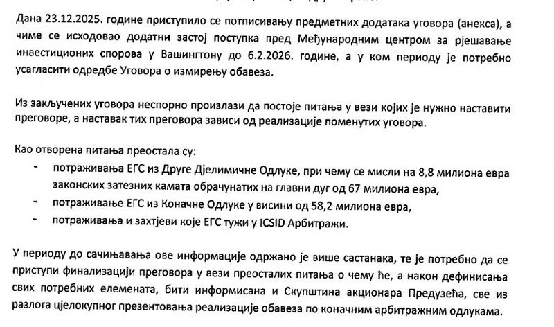 „U daljim pregovorima utvrđen je prijedlog ugovora o isplati duga po konačnoj arbitražnoj odluci, na način da će se umjesto 67 miliona evra isplatiti 37,4 miliona evra, u sedam jednakih rata, počev od 2025. pri čemu rata iznosi 5,3 miliona evra“, navedeno je u informaciji dostavljenoj akcionarima.