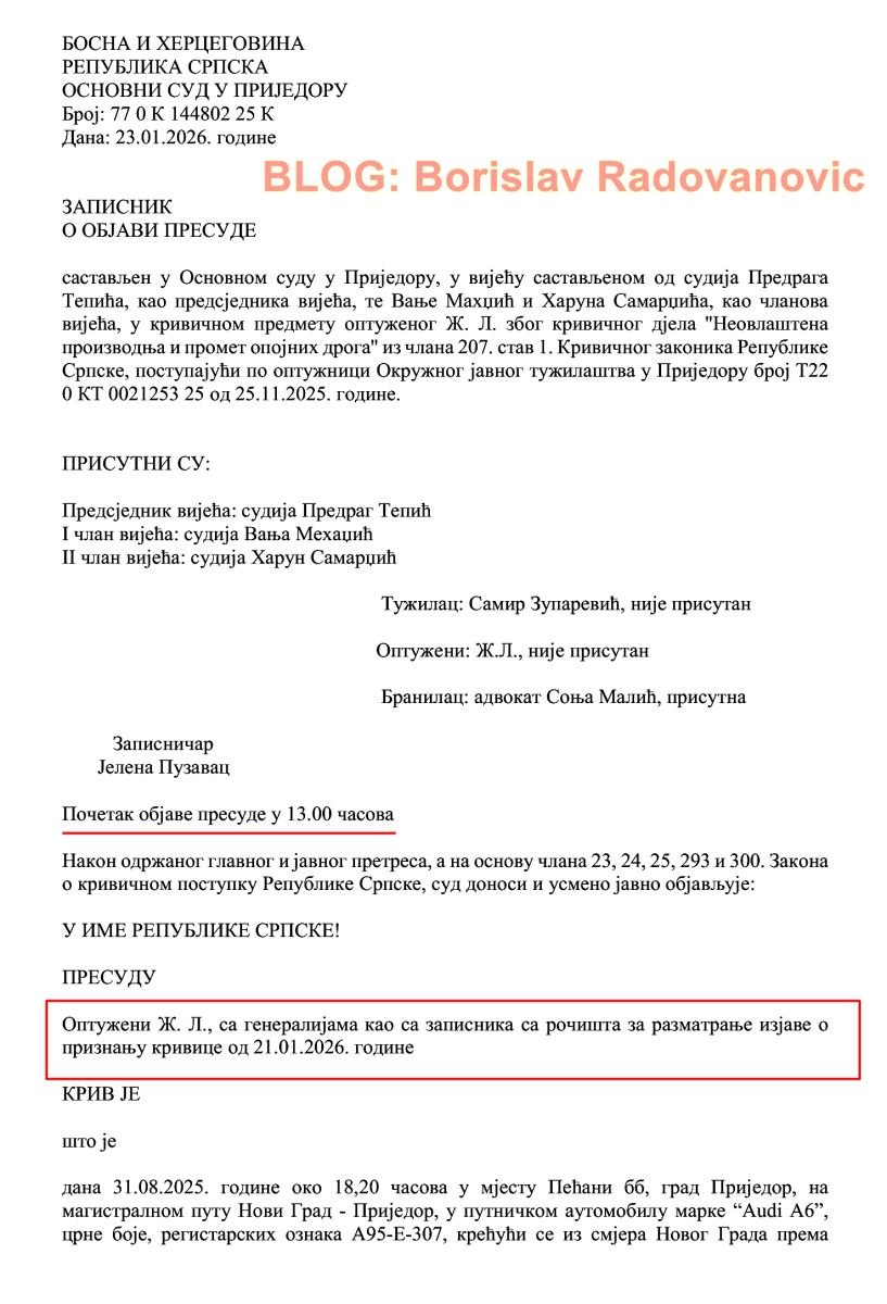 Iz objavljene presude vidite da o identitetu Ž.L. znamo manje negoli prilikom hapšenja pošto se ni Sremska Mitrovica ne pominje. Kako vidite OJT Prijedor je sa "brzopoteznom" optužnicom ustalo već 25.11.2025. godine, iliti za manje od tri mjeseca od hapšenja sa 10 kg kokaina.