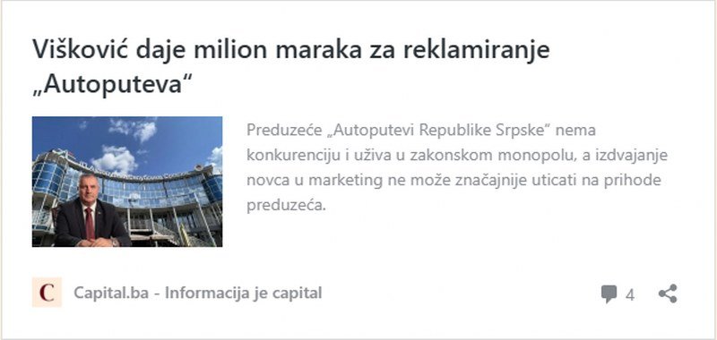 „Autoputevi Republike Srpske“, na čijem je čelu Radovan Višković, dali su ugovor za medijsko predstavljanje izgrađenih i započetih dionica vrijedan 1,1 milion maraka grupi ponuđača sastavljenoj od firmi „DCM media“ i „QDEVS“ iz Banjaluke, saznaje CAPITAL.