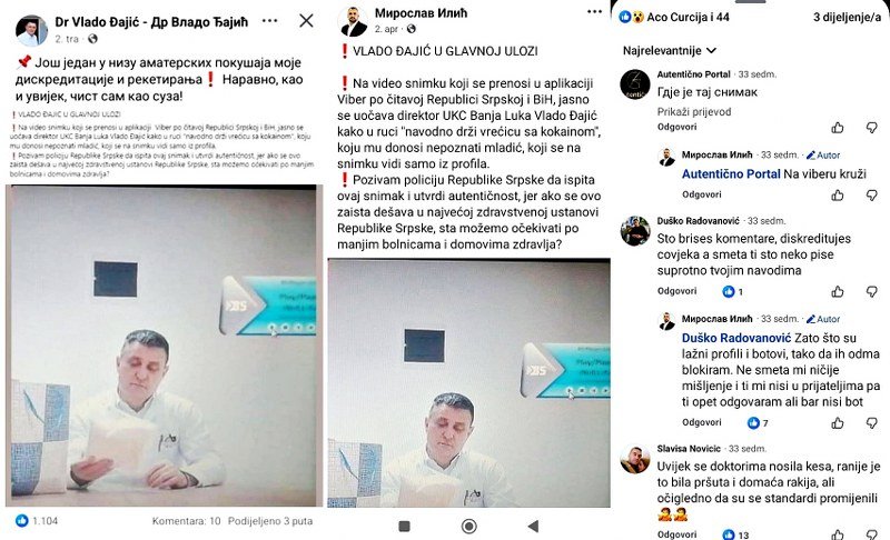 Podnaslovno vidite doktora sa vrećicom jeftinog gipsa u ruci umjesto kokaina kako se manipulativno tvrdi, fotografije očigledno izvedene sa spornog snimka, ali objavljene još 2. aprila ove godine. Na svom profilu doktor Vlado je podijelio sopstvenu sliku i objavu o postojanju snimka "nabavljanja kokaina", te pozivanja policije da "ispita snimak i utvrdi autentičnost" pošto se radi o najvećoj zdravstvenoj ustanovi Republike Srpske.