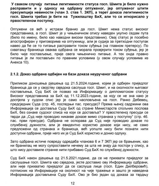 "U svakom slučaju pitanje legitimnosti statusa gosp. Schmidtha je bilo nužno raspraviti i u odnosu na odbranu optuženog, jer optuženog štiti presumpcija nevinosti (član 3. stav 1. ZKP), a teret dokaza legitimnosti gospodina Schmidta trebao je biti na Tužilaštvu BiH, ali to se ignorisalo u prvostepenom postupku. Optuženi se već u istrazi branio da gosp. Šmit nema status visokog predstavnika, a gosp. Schmidth je u činjeničnom opisu naveden ukupno sedam puta (bilo po imenu, bilo kao navodni visoki predstavnik). Ovaj status je posebno apostrofiran u prigovorima na optužnicu, ali je sudija za prethodni postupak naveo da će se to pitanje raspraviti tokom suđenja (na glavnom pretersu). Po shvatanju branioca ovakva odbrana se morala provjeriti tokom suđenja, jer je bilo čije postavljenje, prije svega činjenično pitanje. A tek onda pravno pitanje je li postavljen po pravnim uslovima (u ovom slučaju uslovima iz Aneksa 10), naveo je između ostalog Bubić.