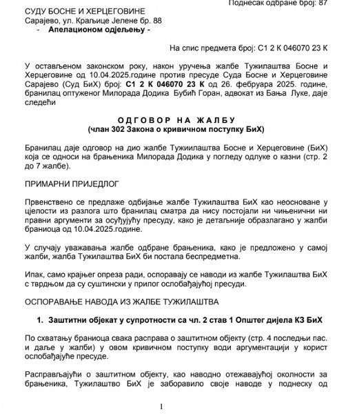 Goran Bubić, advokat Milorada Dodika, nepravosnažno osuđenog predsjednika RS objavio je dan pred sjednicu drugostepenog vijeća u Sudu javno žalbu na presudu predsjednik RS kao i odgovor na žalbu Tužilaštva BiH.