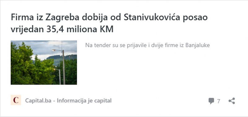 Podsjećamo, naš portal je prvi pisao da će posao vrijedan 35 miliona KM biti dodijeljen zagrebačkom „Končaru“. Ovaj predmet trenutno je pred Kancelarijom za razmatranje žalbi BiH koja samo na osnovu dokaza koje iznosi naš portal može da ospori odluku gradonačelnika Banjaluke.