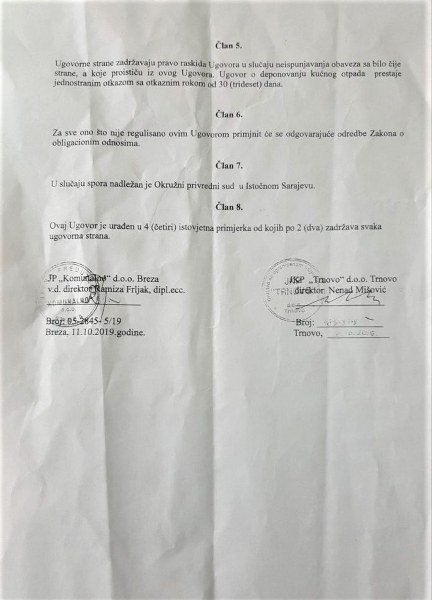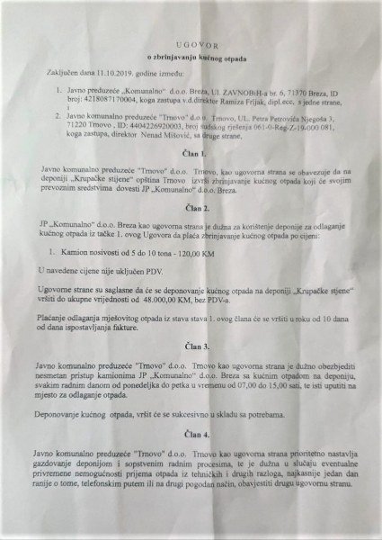 Foto: Faksimil Ugovora potpisanog sa komunalnim preduzećem iz Breze