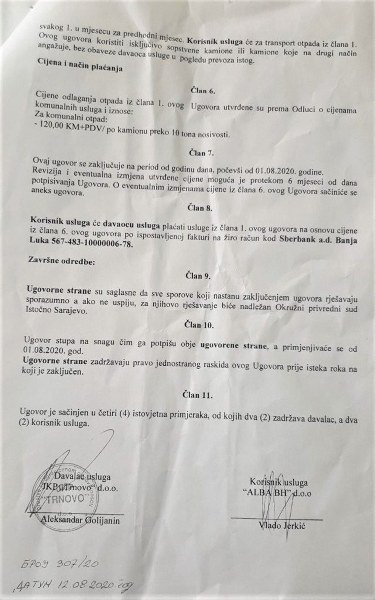 Međutim, novim ugovorom, koji je daleko od očiju javnosti potpisan 1. avgusta 2020. godine između direktora Albe i JKP Trnovo d.o.o. iz Trnova, uz znanje načelnika opštine Trnovo Dragomira Gagovića, prema tvrdnjama nekolicine ogorčenih mještana upoznatim s načinom odlaganja otpada, u pitanje je dovedeno javno zdravlje stanovništva toga kraja, ali cijele regije i grada Sarajeva.