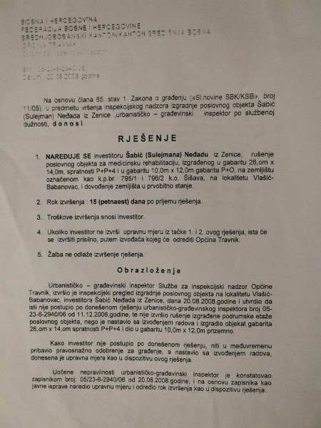 Urbanističko-građevinski inspektor Opštine Travnik nakon dvije godine izvršio je inspekcijski pregled poslovnog objekta na lokalitetu Vlašić-Babanovac i utvrdio da investitor nije postupio po rješenju iz 2006. godine te nije izvršio rušenje podrumske etaže izgrađenog objekta, nego je nastavio sa izvođenjem radova i sagradio objekat spratnosti P+P+4.