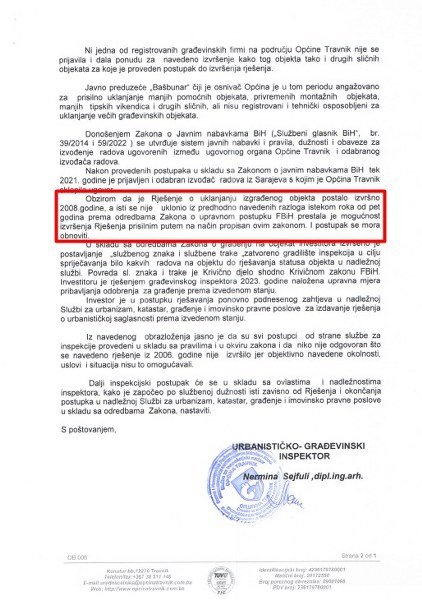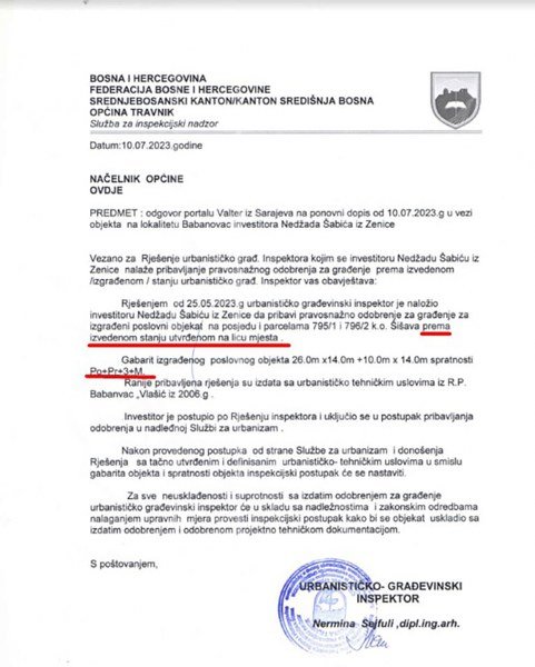 „Za lokaciju predmetnog objekta izdato je Rješenje o urbanističkoj saglasnosti od 15.1.2007. godine i Dopunsko Rješenje od 28.5.2007. godine kojim se ovo Rješenje dopunjuje i odobrava izgradnja podrumske etaže, u jednom dijelu predmetnog objekta, u skladu sa navedenim provedbenim planskim dokumentom. S obzirom da je važenje navedenog rješenja, od jedne godine, isteklo utvrđeno je da nije podnesen zahtjev za produženje ili izmjenu, kao i da nije podnesen zahtjev za izdavanje nove urbanističke saglasnosti“, piše u odgovoru pomoćnika načelnika Službe za opću upravu i boračko invalidsku zaštitu Opštine Travnik, Gordana Zeca.