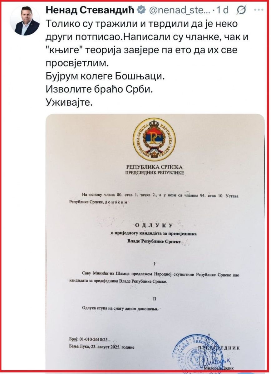 Predsjednik Narodne skupštine Republike Srpske Nenad Stevandić na svom X nalogu objavio je dokument kojim je potvrdio da je građanin Milorad Dodik predložio za mandatara kuma Savu Minića, nekadašnjeg ministra poljoprivrede, šumarstva i vodoprivrede RS.