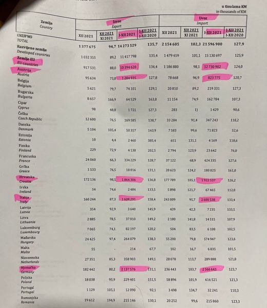 "Da li Dodik zna da prekid odnosa sa Njemačkom može da znači kolaps za našu privredu koja je prošle godine imala najveću spoljnotrgovinsku razmjenu (izvoz i uvoz) sa Njemačkom i to 4,7 milijardi КM ili preko 13% od ukupne, slijede Italija (4,2 milijarde КM) i Srbija (4,15 milijardi КM) sa po 12% od ukupne razmjene (zvanični podaci Agencije za statistiku BiH)?"