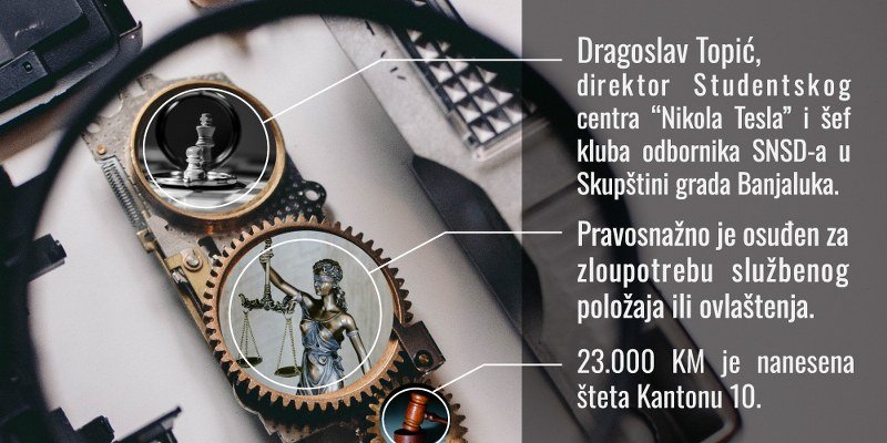 Dragoslav Topić, direktor Studentskog centra “Nikola Tesla” i šef kluba odbornika SNSD-a u Skupštini grada Banjaluka, daleko od očiju javnosti pravosnažno je osuđen za zloupotrebu službenog položaja ili ovlaštenja “tešku” 23.000 KM, saznaje eTrafika.