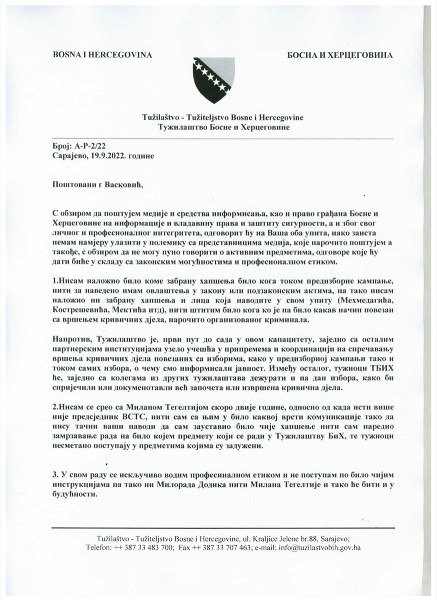 "Nedavno ste bili sa Milanom Tegeltijom, savjetnikom Milorada Dodika, člana Predsjedništva BiH, kojem ste tom prilikom pričali o istragama i saopštili da ste zaustavili sva hapšenja, i da ste naredili da se predmeti protiv Milorada Dodika zamrznu do daljnjeg. Nije li takvo Vaše djelovanje u suprotnosti sa ponašanjem Glavnnog tužioca i da li ste na taj način, po Vama, pokazali da Vi radite za Dodika, njegovog savjetnika Tegeltiju, koji je smijenjen sa pozicije predsjednika VSTS, upravo zato što je bio u funkciji političkih elita i pravosuđe pretvorio u njegovu suprotnost, a ne za građane BiH?