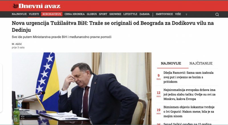 9, Dnevni Avaz danas je objavio da je “Ministarstvo pravde BiH, na zahtjev državnog tužilaštva, poslalo prošle sedmice Srbiji novu urgenciju u kojoj se od ove države traži dostavljanje dokumentacije o kupovini vile na Dedinju za koju je Milorad Dodik, lider SNSD-a i još aktuelni član Predsjedništva BiH, 2007. godine izdvojio 1,4 miliona maraka”.