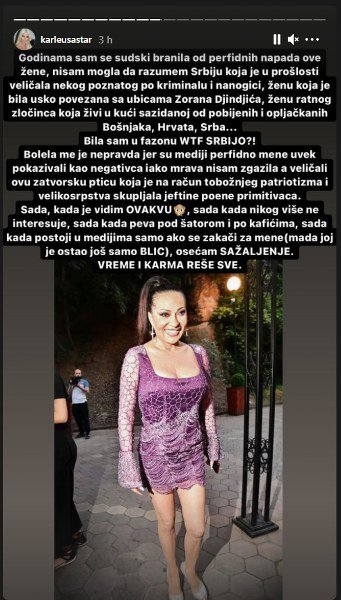 "Godinama sam se sudski branila od perfidnih napada ove žene, nisam mogla razumeti Srbiju koja je u prošlosti veličala nekog poznatog po kriminalu i nanogici, ženu koja je bila usko povezana s ubicama Zorana Đinđića, ženu ratnog zločinca koja živi u kući sazidanoj od pobijenih i opljačkanih Bošnjaka, Hrvata, Srba... Bila sam u fazonu WTF SRBIJO?", započela je Jelena na svom storyju.