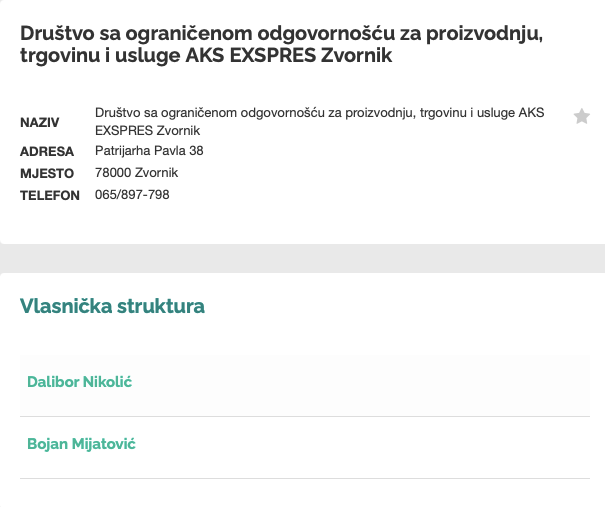 Firma je registrovana na bliskog Mijatovićevog srodnika, Bojana Mijatovića i Dalibora Nikolića, sina člana zvorničke Građevinske mafije, na čijem čelu su Gladni, zajedno sa Sinišom Mijatovićem i Dejanom Ilićem Tigrom.