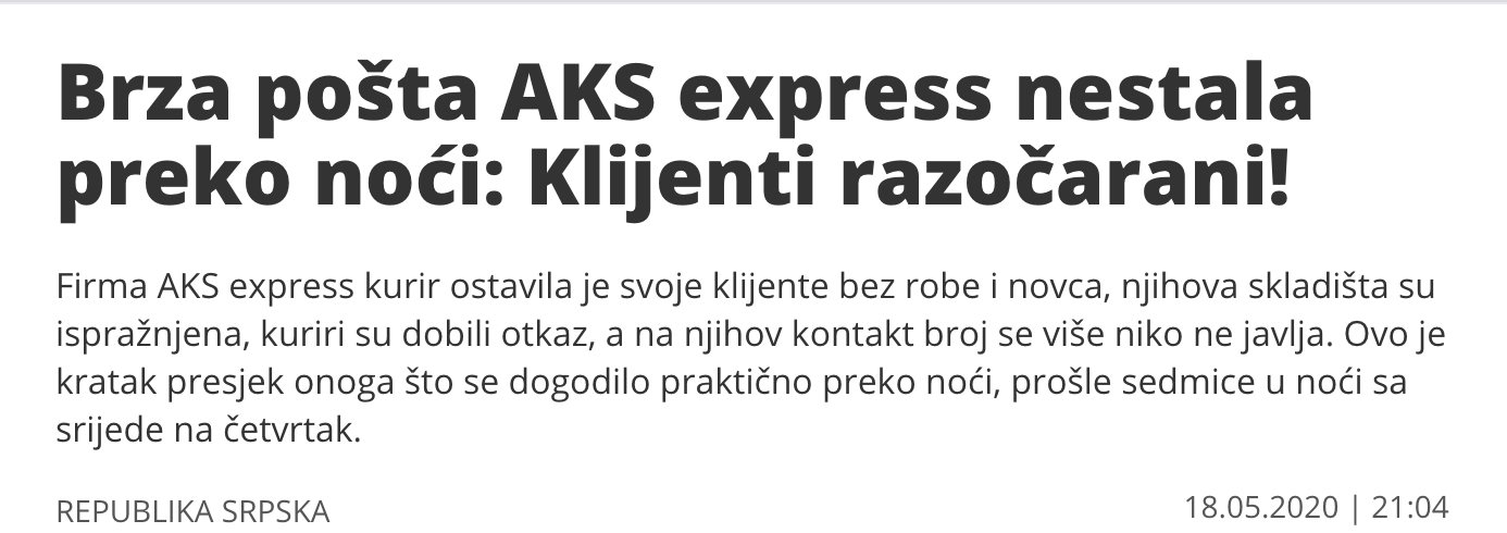 7. U noći 17/18.05.2020. godine, “AKS express” jednostavno je “isparila”, ostavila klijente bez robe i novca, ispraznili su svoja skladišta, kuriri su dobili otkaz, a na njihov kontakt broj se niko nije javljao.
