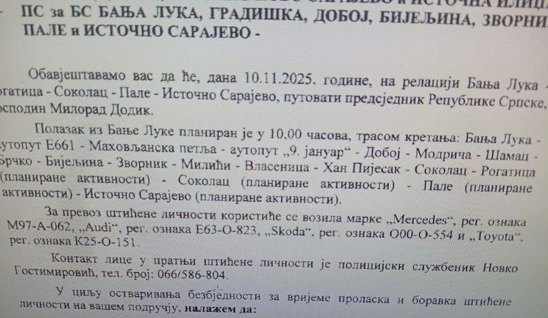 „Nalažem da PU Banja Luka, Gradiška, Doboj, Bijeljina, Zvornik i Istočno Sarajevo obezbijede nesmetano kretanje i boravak štićene ličnosti na svom području, te da izvrše fizičko, operativno i saobraćajno obezbjeđenje trase kretanja“, navodi se u Šarićevom dopisu.