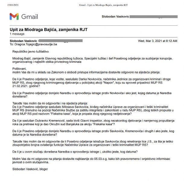 1. Nisam još uvijek dobio nikakve odgovore od Miodraga Bajića, zamjenika Glavnog republičkog tužioca, Specijalnog tužiloca i šefa Posebnog odjeljenja za suzbijanje korupcije, organizovanog i najtežih oblika privrednog kriminala o tome da li je saslušan Milosav Savković, bivši načelnik Uprave za organizovani i teški kriminalitet MUP RS (trenutno na poziciji Načelnika Službe za zaštitu integriteta i zakonitosti u radu MUP RS), zbog teških propusta u akciji MUP RS pod nazivom "Fiskalna kasa", koja je propala zbog njegovog nedjelovanja?