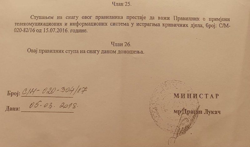 Dragan Lukač, vlasnik MUP RS, Neustavni i Nezakoniti “Pravilnik o primjeni telekomunikacionih sistema u istragama krivičnih djela”, koji pripadnicima njegove Hunte omogućava ilegalno snimanje, praćenje i prisluškivanje bilo kog stanovnika RS, potpisao je 05.03.2018. godine.
