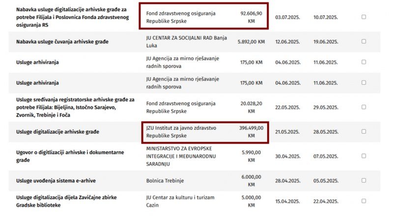 Usluge elektronskog arhiviranja dokumenata Pošte Srpske platile su 300.000 KM, dok je za indeksiranje, skeniranje i mikrofilmovanje dokumentacije Fond PIO RS izdvojio 230.000 KM. Za integrisani sistem upravljanja poslovnom dokumentacijom i arhivom u JZU Bolnica Sveti apostol Lukau Doboju dali su 200.000 KM.
