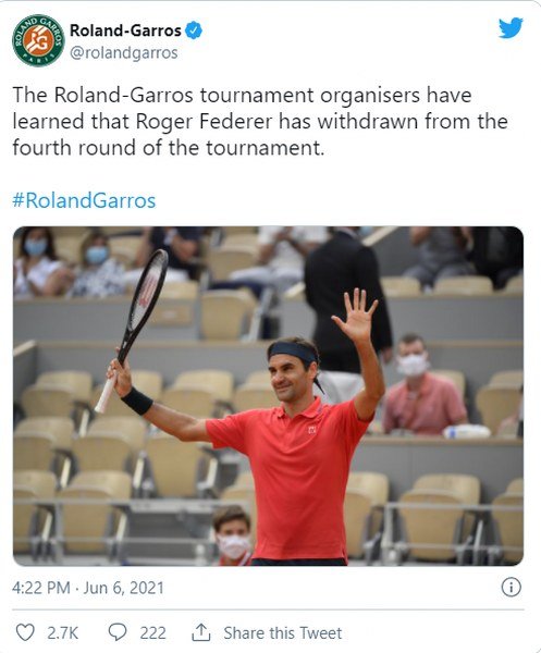 Švajcarski teniser Rodžer Federer se povukao sa Rolan Garosa nakon pobede u trećem kolu.