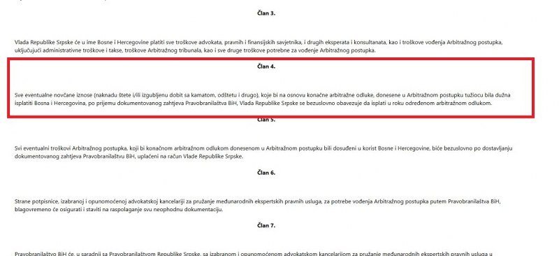 U tom sporazumu je jasno precizirano da će Vlada Republike Srpske bezuslovno isplatiti Viaductu svu odštetu utvrđenu na osnovu konačne arbitražne odluke, koju bi u Arbitražnom postupku Viaductu bila dužna isplatiti Bosna i Hercegovina u određenom roku.