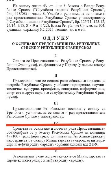 No, vratimo se Birou Srpske u Parizu. U februaru ove godine Vlada Republike Srpske donijela je odluku o osnivanju predstavništva Republike Srpske u Francuskoj. Pod tačkom četiri piše da su “sredstva za osnivanje i početak rada Predstavništva obezbijeđena u Budžetu Republike Srpske”.