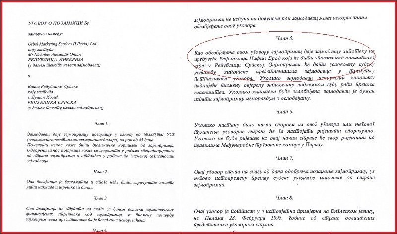Vlasti Republike Srpske predvođene Radovanom Karadžićem su 1995. godine upisale Rafineriju Brod kao hipoteku na pozajmicu od 60 miliona dolara liberijskoj kompaniji "Orbal Marketing Service"!? Prema ugovoru o pozajmici kojeg Žurnal posjeduje, rok za povrat duga bio je 45 dana.