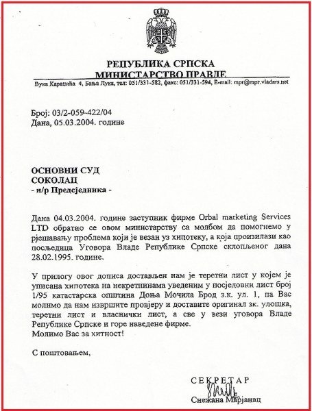 Hipoteka je ovjerena na sudu u Sokocu i aktelizirana je marta 2004. kada je od Vlade RS zatražena naplata duga!? Vlasnik "Orbal Marketing Service" bio je Slovenac sa australijskim državljanstvom Nicholas Alexander Oman, krijumčar oružjem i nadasve prevarant.