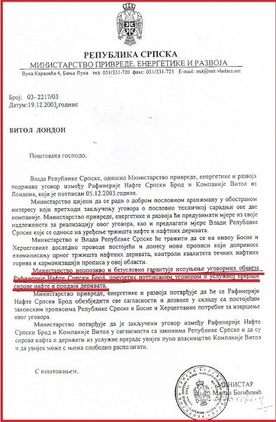 Foto: Faksimil dopisa ministra Bogičevića - podrška ugovoru sa Vitolom