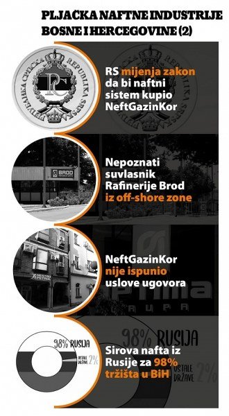 „Režim već nekoliko godina želi da predstavi da je Rafineriju kupila Ruska državna kompanija „Zarubnježneft“ što nije tačno, jer je kupac, u stvari, „Neftegazovaja Inovacionaja Korporacija“(Njeftgazinkor), a to je akcionarsko društvo u kojem Zarubnježneft ima samo vlasnički udio, a ostali suvlasnici su nepoznata fizička i pravna lica. Već dugo se špekuliše ko su vlasnici „Njeftgazinkora“ osim Zarubnježnefta, pa ima i onih koji govore da su ti vlasnici i režimski prvaci iz RS,“ ukazivao je bivši predsjednik RS Dragan Čavić u vrijeme dok je bio opozicionar Dodiku i SNSD-u.
