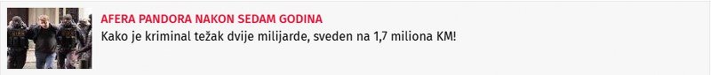 Pred Komisijom za borbu protiv korupcije Parlamentarne skupštine BiH naći će se 270 stranica dokumentacije o kriminalu teškom milijarde KM u Upravi za indirektno oporezivanje BiH. Na zahtjev Samostalnog sindikata državnih službenika i zaposlenika UIO BiH sutra će ponovo biti otvorena afera „Pandora“ – javnom raspravom i saslušanjem o slučaju u kojem je državni budžet, prema procjenama, oštećen za oko dvije milijarde KM.