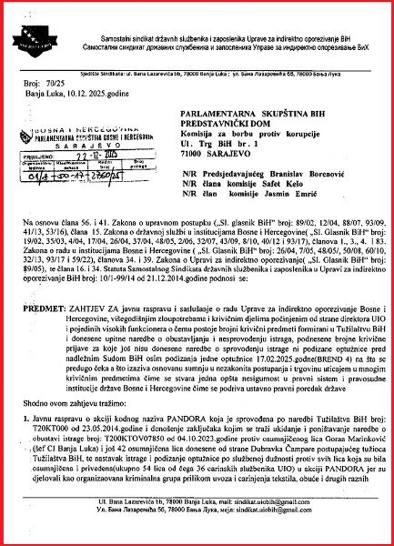 Sindikat državnih službenika i zaposlenika UIO BiH zatražio je od Komisije za borbu protiv korupcije Parlamentarne skupštine BiH javnu raspravu i saslušanje o aferi „Pandora“, kao i donošenje zaključaka kojima se traži poništavanje odluke o obustavi istrage i ponovno otvaranje predmeta protiv više od 50 osumnjičenih za carinske malverzacije i krijumčarenje robe iz Kine i Turske. Bila je to afera „teška“ dvije milijarde KM. Saslušanja su zakazana za 10. i 17. mart.