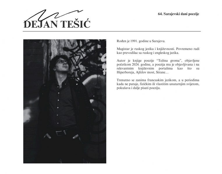 U okviru programa predstavio se i Dejan Tešić. „Fasciniran sam činjenicom da kroz poeziju možemo izraziti svoje stavove i time se vodim kada pišem svoje pjesme“