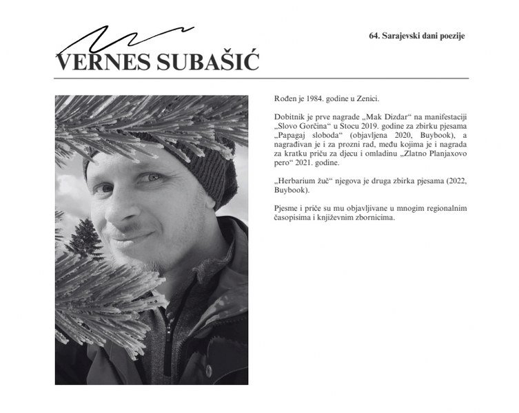 U sklopu programa svoju poeziju predstavio je Vernes Subašić, autor iz Zenice, dobitnik nagrade „Slovo Gorčina“. Kako je istakao, u pripremi je njegova treća zbirka poezije. „Sebe ne smatram pjesnikom, strastveni sam ljubitelj poezije i kao „čitalački talog“ inspiracija za stvaranje vlastitih pjesama se, jednostavno, dogodila“ – istakao je Subašić.