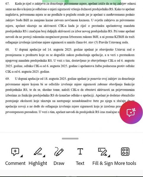 Nakon što ga je osudio Sud BiH, Dodik i njegov pravni tim izjavljuju apelaciju Ustavnom sudu BiH čiji sadržaj, dostupan u odluci tog suda broj AP-3722/25 od 4.11.2025. godine, govori da je Dodik išao toliko daleko u borbi za sebe, a ne za Republiku Srpsku, da je o navedena dva zakona Narodne skupštine u svojoj apelaciji tvrdio sledeće, što je zapisano u stavu 66. navedene odluke Ustavnog suda BiH: