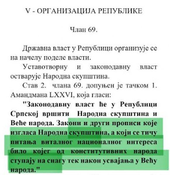 Ove ustavne odredbe se zatim moraju dovesti u vezu sa tačkom 1. Amandmana LXXVI kojom je dopunjen stav 2. člana 69. Ustava Republike Srpske, kojim je sada propisano da ne samo zakoni nego i drugi propisi koji se tiču pitanja vitalnog nacionalnog interesa bilo kojeg od konstitutivnih naroda stupaju na snagu tek nakon usvajanja u Vijeću naroda Republike Srpske.