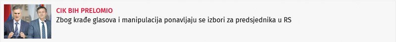 Zbog manipulacije potpisima birača, nezakonitog rada biračkih odbora i dopuštanja da oko 2.000 ljudi glasa bez ijednog važećeg dokumenta tokom održavanja vanrednih predsjedničkih izbora u Republici Srpskoj 23. novembra prošle godine Centralna izborna komisija Bosne i Hercegovine odlučila je da proces bude ponovljen na 136 biračkih mjesta u 17 izbornih jedinica. Ipak, da se građaninu Miloradu Dodiku ne bi baš toliko zamjerala, nije dozvolila akreditovanje novih posmatrača.