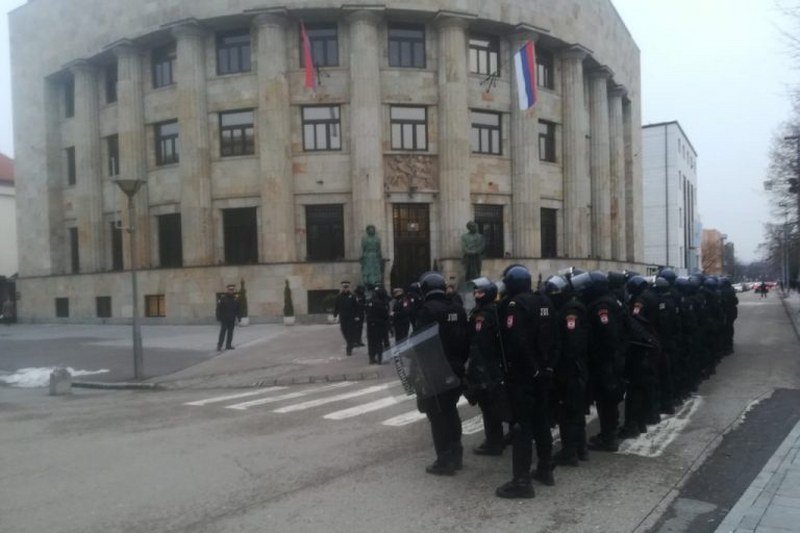 Ispred Palate Republike pedesetak je policajaca Jedinice za podršku. Oni nešto prije 16 časova kreću ka trgu sa kojeg su građani već potisnuti u Park Petra Kočića.