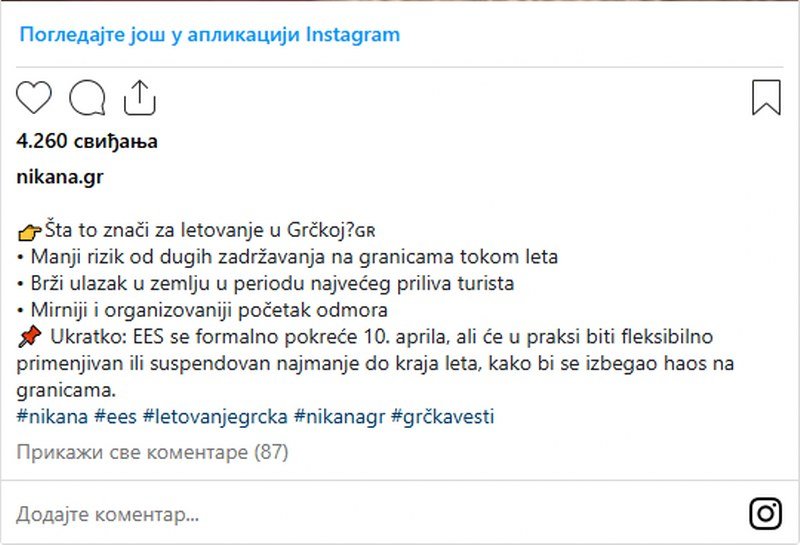 "Države članice imaju fleksibilnost od 90 dana, uz mogućnost produženja za dodatnih 60 dana – praktično pokrivajući cijelu sezonu. To znači da će se na mnogim granicama koristiti klasična pasoška kontrola sa ručnim pečatom, umjesto obavezne biometrijske registracije", navodi "Nikana.gr" na Instagramu.