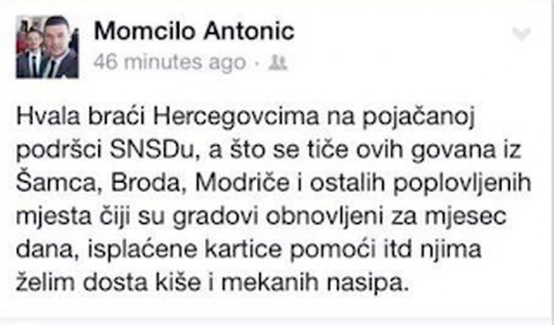 21. Momčilo Ajhman Antonić je, bahato, drsko i u skladu sa matricom vrha SNSD-a, koji narod u RS tretiraju kao roblje, u vrijeme velikih poplava 2014., na svom FB profilu napisao: „Hvala braći Hercegovcima na pojačanoj podršci SNSD-u, a što se tiče ovih govana iz Šamca, Broda, Modriče i ostalih poplavljenih mjesta čiji su gradovi obnovljeni za mjesec dana, isplaćene kartice pomoći itd., njima želim dosta kiše i mekanih nasipa”.