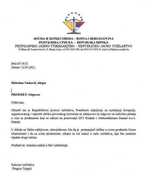 “Obratili ste se Republičkom javnom tužilaštvu, Posebnom odjeljenju za suzbijanje korupcije, organizovanog i najtežih oblika privrednog kriminala sa zahtjevom za odgovor na nekoliko pitanja u vezi sa predmetom koji se odnosi na poslovanje EFT Rudnik i Termoelektrana Stanari d.o.o. Stanari.