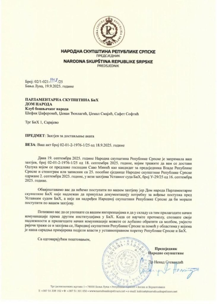 "Obavještavamo vas da nećemo postupiti po vašem zahtjevu, jer Dom naroda PSBiH nije nadležan da prikuplja dokumentaciju potrebnu za vođenje postupka pred Ustavnim sudom BiH, a nije ni nadređen Narodnoj skupštini RS da bi morali postupiti po vašem zahtjevu. Pozivamo vas da se upoznate s vašim ingerencijama i da u skladu s tim prilagodite način komunikacije prema drugim institucijama u BiH.