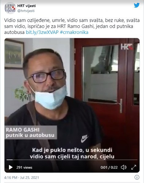 Ramo Gashi, jedan od putnika autobusa kazao je za HTV: - Kad je puklo nešto, u sekundi vidio sam cijeli taj narod, cijelu livadu, dolje, taj kanal...Vidio sam ozlijeđene, umrle, vidio sam svašta, bez ruke, svašta sam vidio...