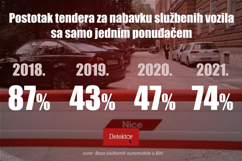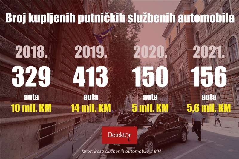 Tokom 2021. godine u Bosni i Hercegovini je raspisano 429 tendera za nabavku 749 vozila procijenjene vrijednosti veće od 46 miliona maraka. Rukovodioci institucija i javnih kompanija potrošili su sedam miliona više na službena vozila nego u prvoj godini pandemije – gotovo 29 miliona KM na sva vozila koja osim putničkih uključuju i sva druga vozila.