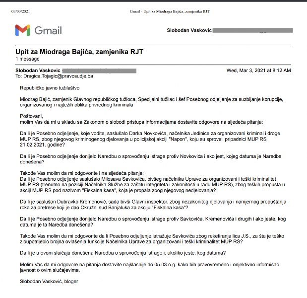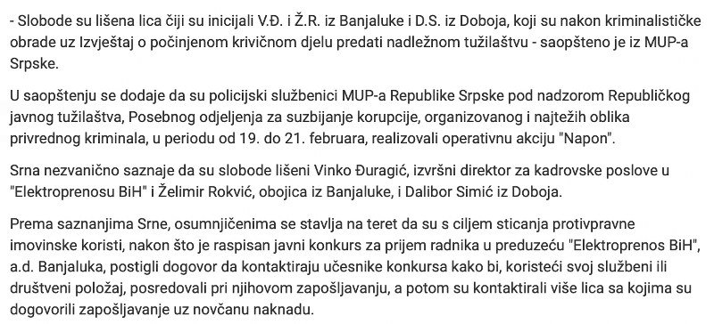 3. Vratimo se Novkoviću, koji je uništio policijsku akciju “Napon”, koju su uzalud sprovodili pripadnici policije 21.02.2021. godine; Uzalud, jer su osumnjičeni i pohapšeni (potom i pušteni) Vinko Đuragić, izvršni direktor za kadrovske poslove preduzeća "Elektroprenosa BiH", Želimir (Željko) Rokvić i Dalibor Simić, bili obaviješteni da se sprema akcija njihovog privođenja.