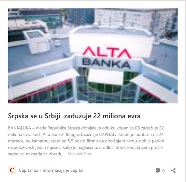 Samo nekoliko dana kasnije, kao što je objavio CAPITAL, Vlada je donijela odluku kojom se RS zadužuje 22 miliona evra kod „Alta banke“ Beograd.